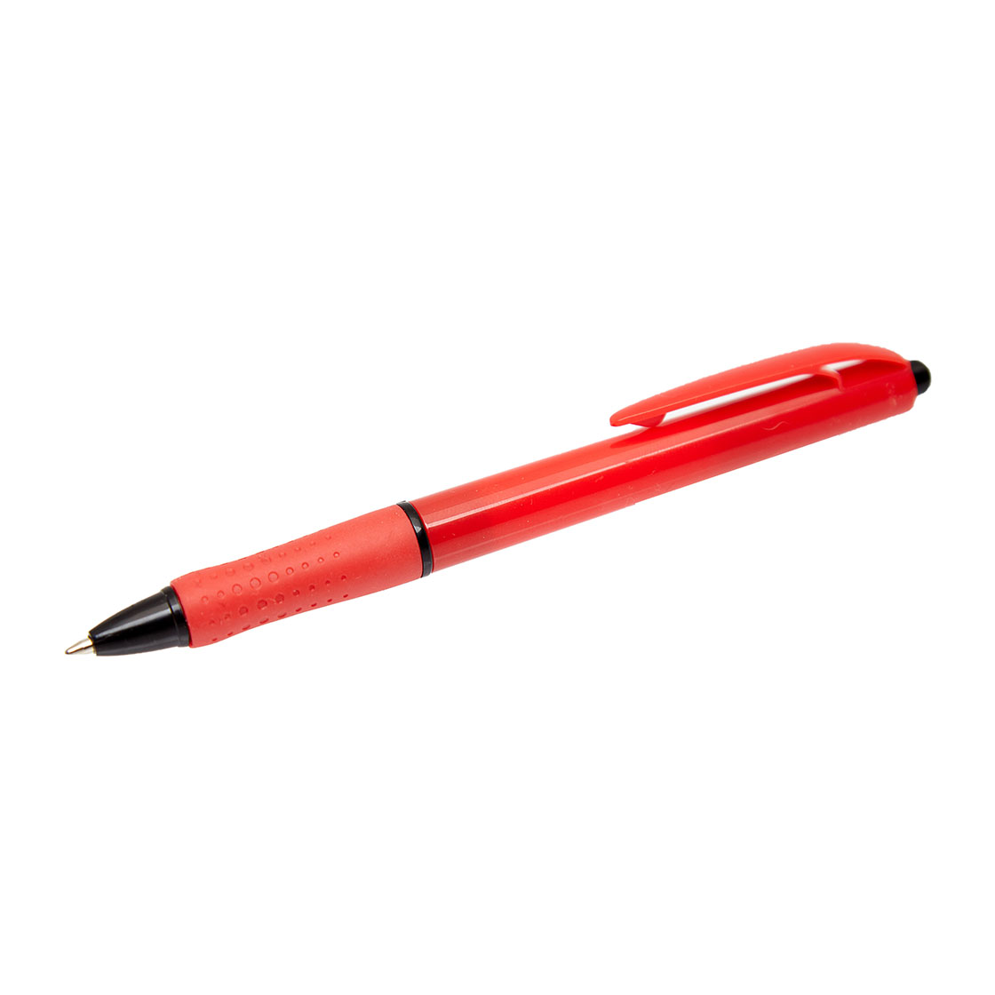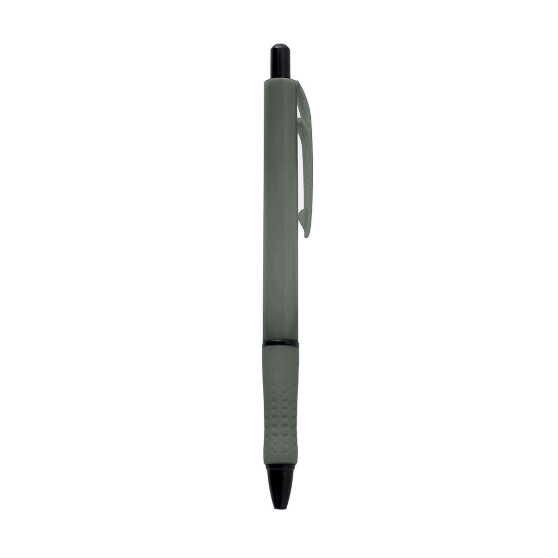 Bolígrafo con cuerpo plástico de color. Grip de goma combinado con el cuerpo. Pulsador negro. Retráctil. Tinta negra. Tahg