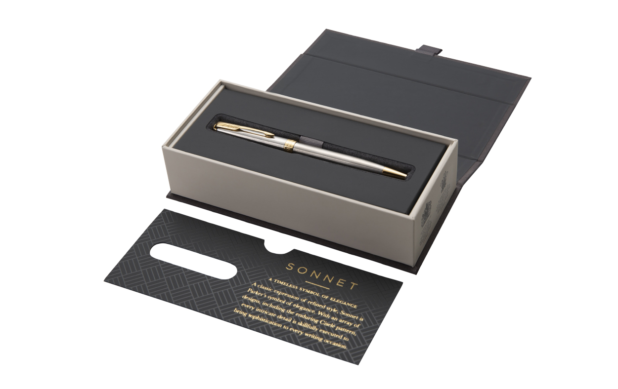 Bolígrafo de acero inoxidable dorado con punta media. Este modelo es el símbolo de la elegancia y una muestra clásica de estilo refinado de la marca. Incluye estuche y bolsa de regalo con el logo de Parker. Tinta Negra (1931507)