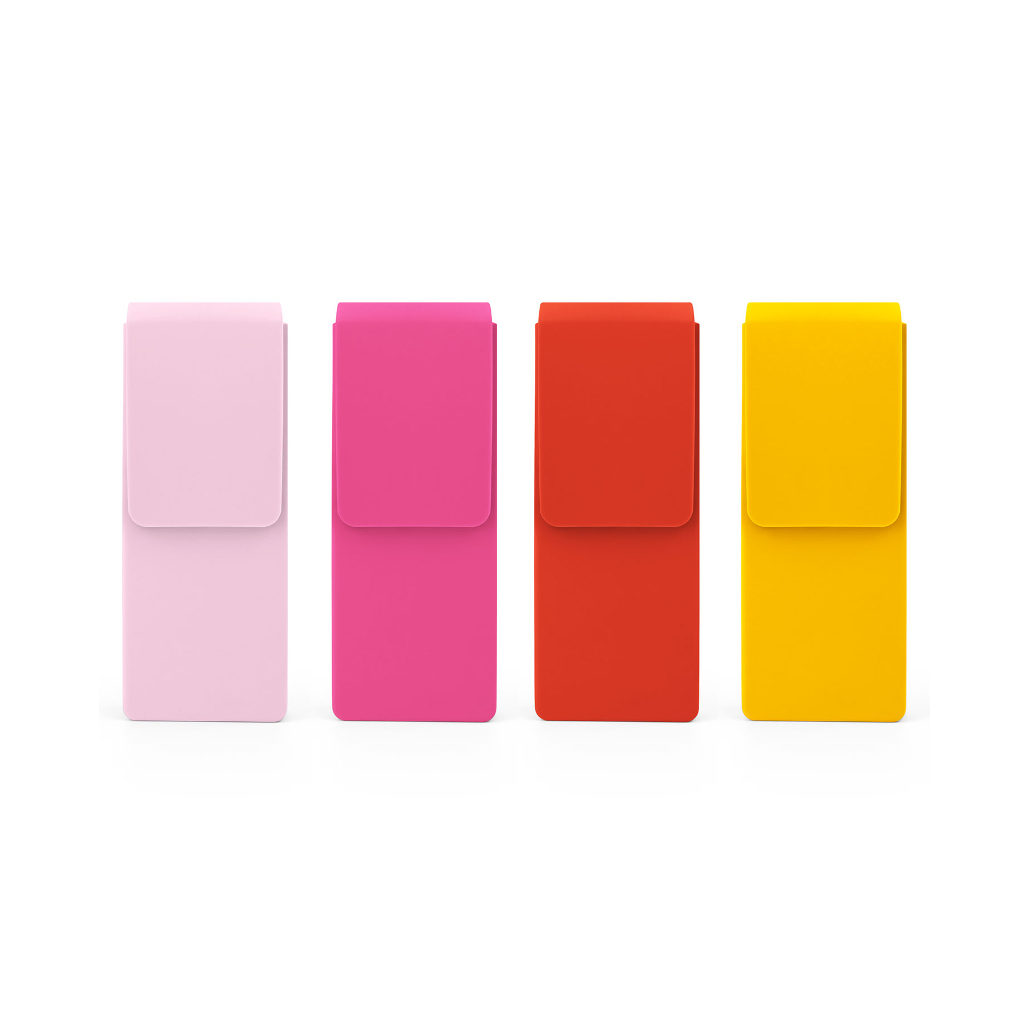 7,5 x 18,5 x 2,7 cm. Silicona. Cartuchera de silicona extra suave. Tiene una solapa imantada y es muy canchera para llevarla a todos lados. Presentación en caja de regalo.