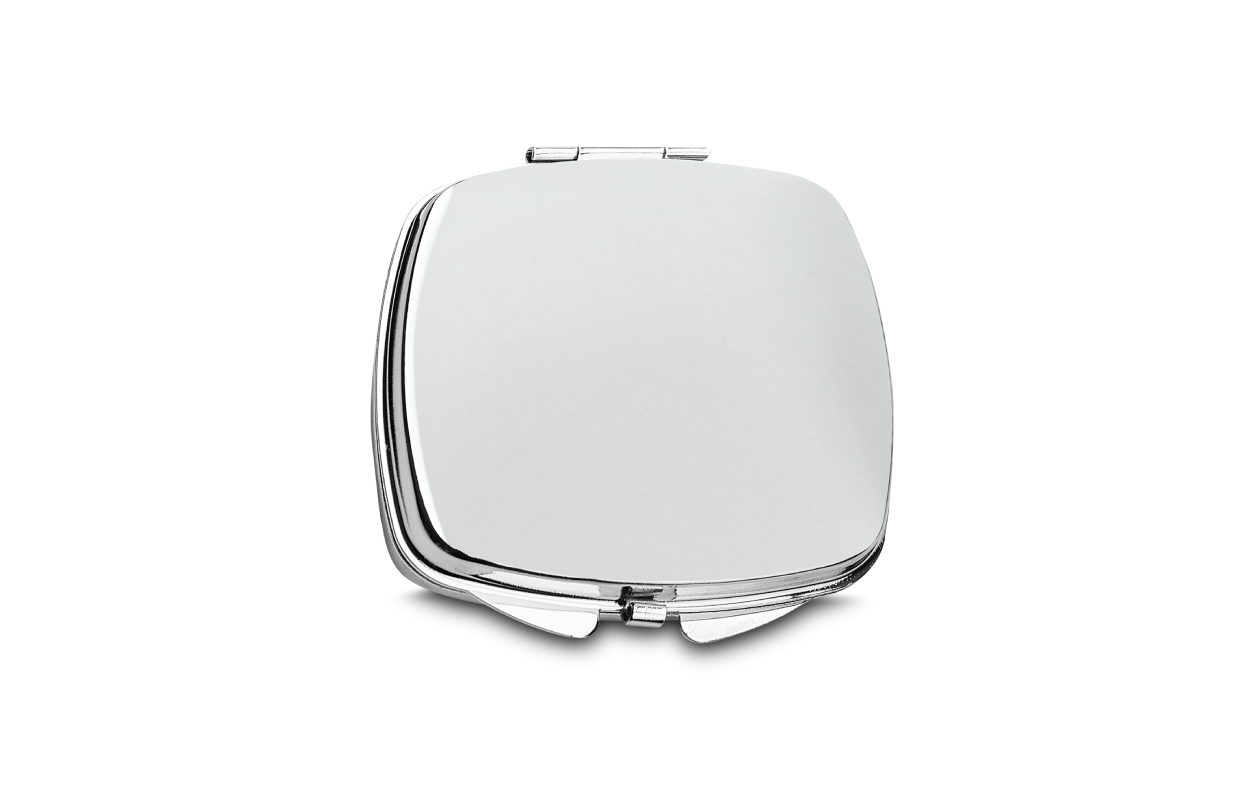 Espejo cuadrado de metal con detalle cromado en una cara del producto.