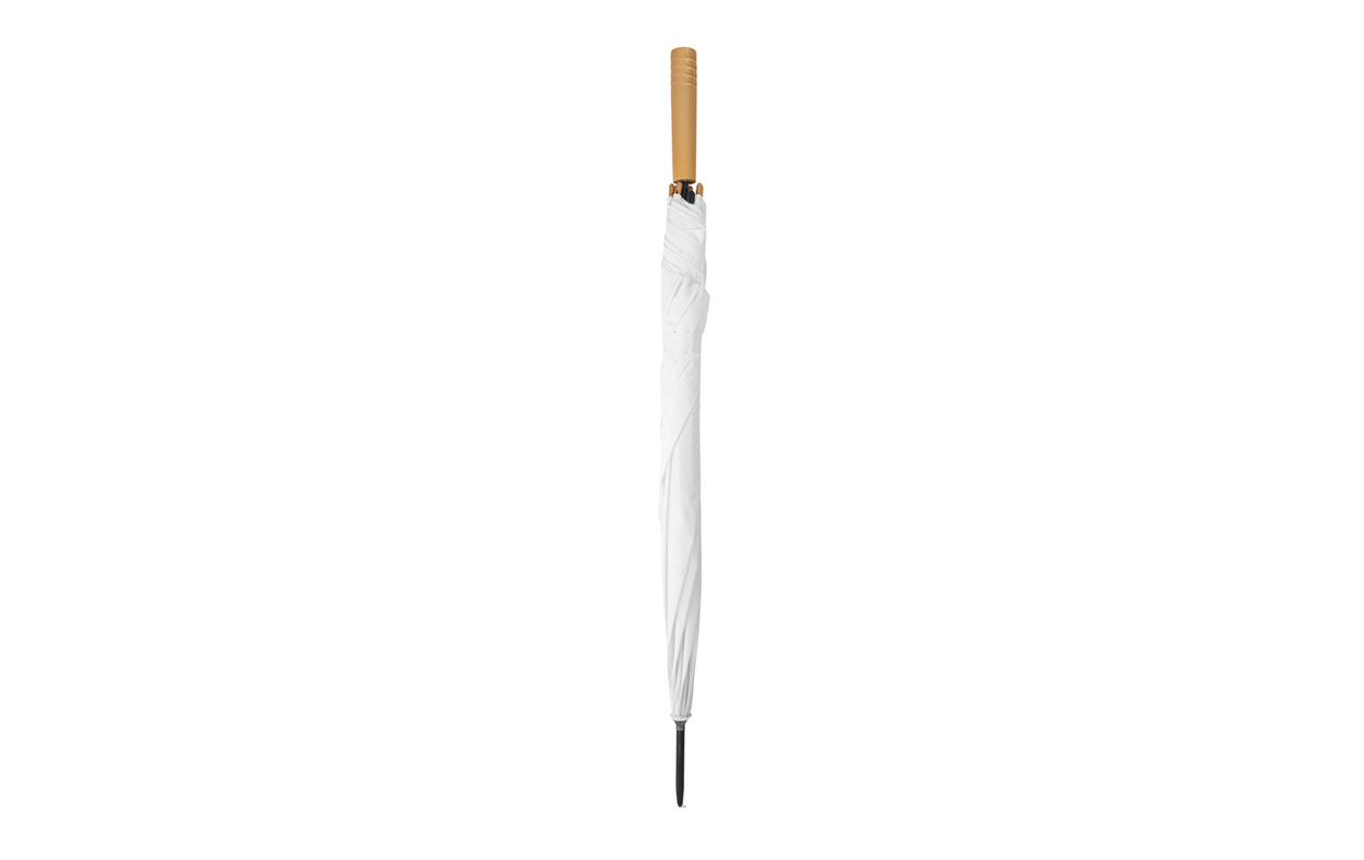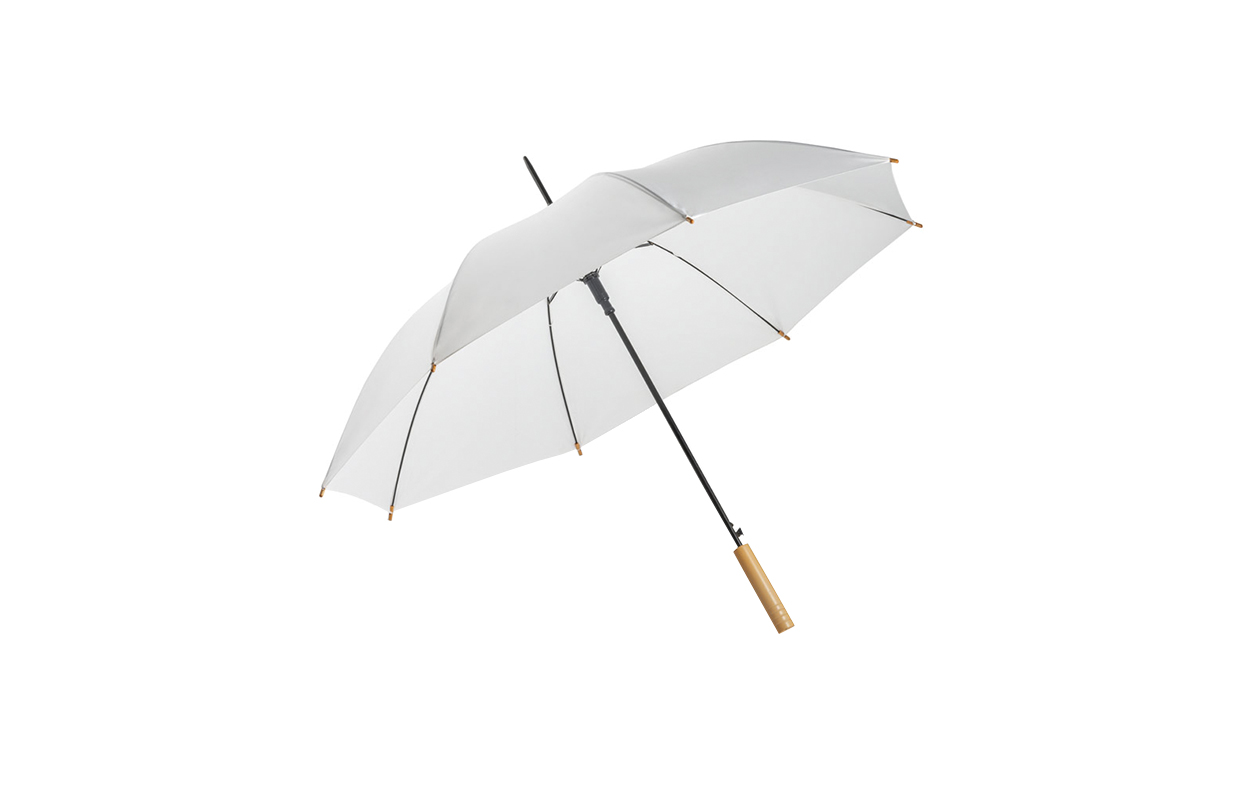 Paraguas de 8 gajos, fabricado en rPet (Pet reciclado). Con mango de madera, y estructura y puntera metálicas. Con mecanismo de apertura automática.