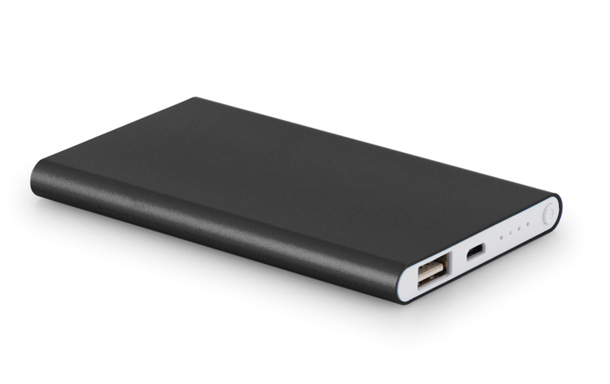 Power Bank de aluminio con batería de polímero de litio. Cuenta con una capacidad de 4000 mAh y una vida útil de mas de 500 ciclos. Tiene una entrada de 5V/1A, salida de 5V/1A y LED con indicador de carga. Dispone de 2 puertos USB para poder cargar mas de un celular. Incluye un cable USB/micro USB para cargar la batería y es suministrado en una caja de regalo
