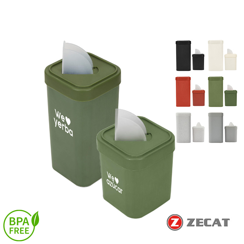 Set de yerbera y azucarera con diseño rectangular, hecho en poliestireno con pico vertedor en la tapa. Cuenta con Laterales con terminación texturada y lisa. Medidas: Yerbera: 9 x 17 cm. Azucarera: 9 x 11 cm. Capacidades: Yerbera: 300 grs. Azucarera: 500 grs. Colores: negro, verde militar, marfil y ladrillo. Producto libre de BPA. Zecat